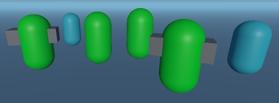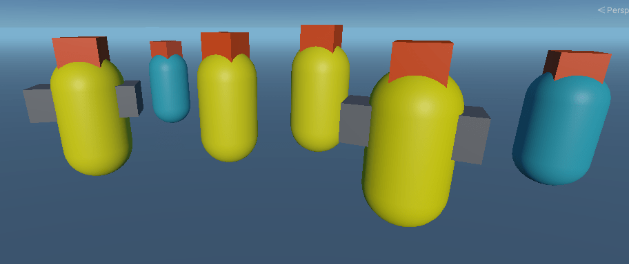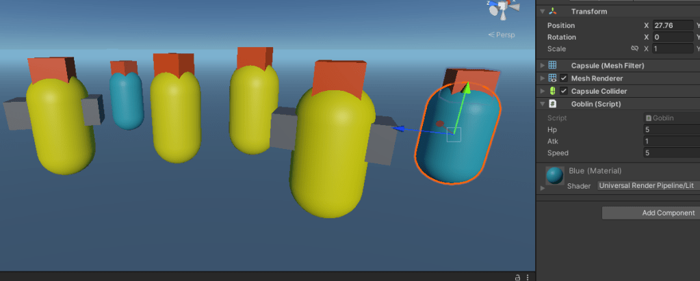 เมื่อออกมาในหน้า scene จะเห็นได้ว่า goblin ทุกตัวใส่หมวกและมีสีเหลือง ยกเว้น goblin สีฟ้าที่ไม่ยอมเปลี่ยนสีเพราะเราได้ทำการ override สีใน prefabs variant ไปแล้ว ทำให้ไม่ถูกทับด้วยข้อมูลจาก prefabs หลัก
