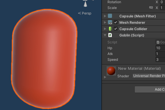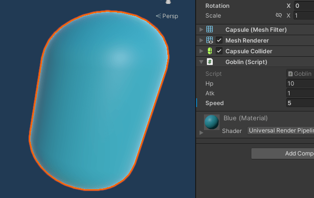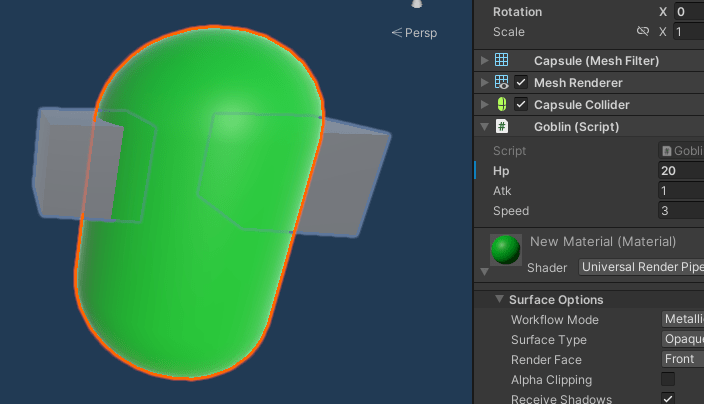 Unity จะทำการสร้าง Prefabs Variant ขึ้นมาจาก goblin ที่เราเลืออกและจะมีหน้าตาดังภาพ โดย prefabs variant สามารถนำมา edit ได้เหมือน prefabs ตามปกติ โดยผู้เขียนจะทำการใส่เกราะ (cube สีเทา) และเพิ่ม hp เป็น 20 ตามรูป (สังเกตุว่าค่าที่ปรับที่แตกต่างจากตัว goblin หลักจะมีแถบสีฟ้าข้างหน้า)
