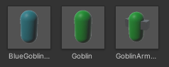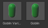 goblin อีกชนิดที่ผู้เขียนต้องการสร้างคือ goblin สีฟ้า ที่มีความเร็วมากกว่าปกติ สามารถทำได้โดยการสร้าง Prefabs Variant จากตัวหลักอีกครั้ง ดังรูป